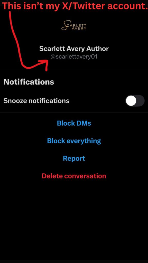 X/Twitter – It was brought to my attention by a number of readers and authors who were duped by another account on X is passing as me. The following account isn’t me. Please DO NOT interact with this person, thinking it’s me. They stole my trademarked name, logo, and promotional banners.