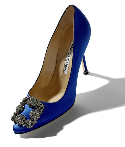 Harley’s Manolo Blahnik Hangisi blue satin jewel buckle heels