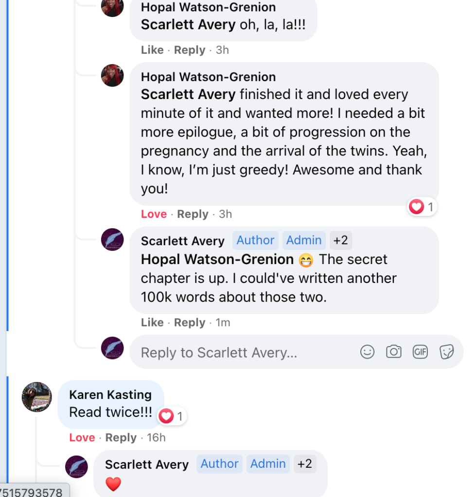 Come over and join my hardcore readers, my proofreaders, and my advance readers: ScarlettAverySexySirens